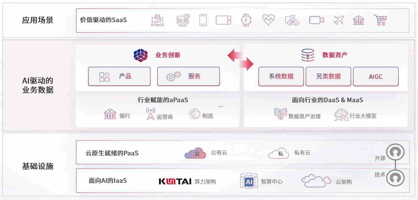 数字时代,,,,围绕企业数字化转型的关键要素,,,,72886必赢欢迎光临数码开创性的提出数云融合战略和技术体系框架,,,着力在云原生、、、、数字原生、、AI原生和信创产业上架构产品和服务能力,,,,为处在不同数字化转型阶段的快消零售、、、汽车、、金融、、、医疗、、、政企、、、、教育、、、、运营商等行业客户提供泛在的敏捷IT能力和融合的数据驱动能力,,,,构建跨界融合创新的数字业务场景和新业务模式,,,助力企业级客户建立面向未来的核心能力和竞争优势,,,,全面推动社会的数字化、、智能化转型升级。。
